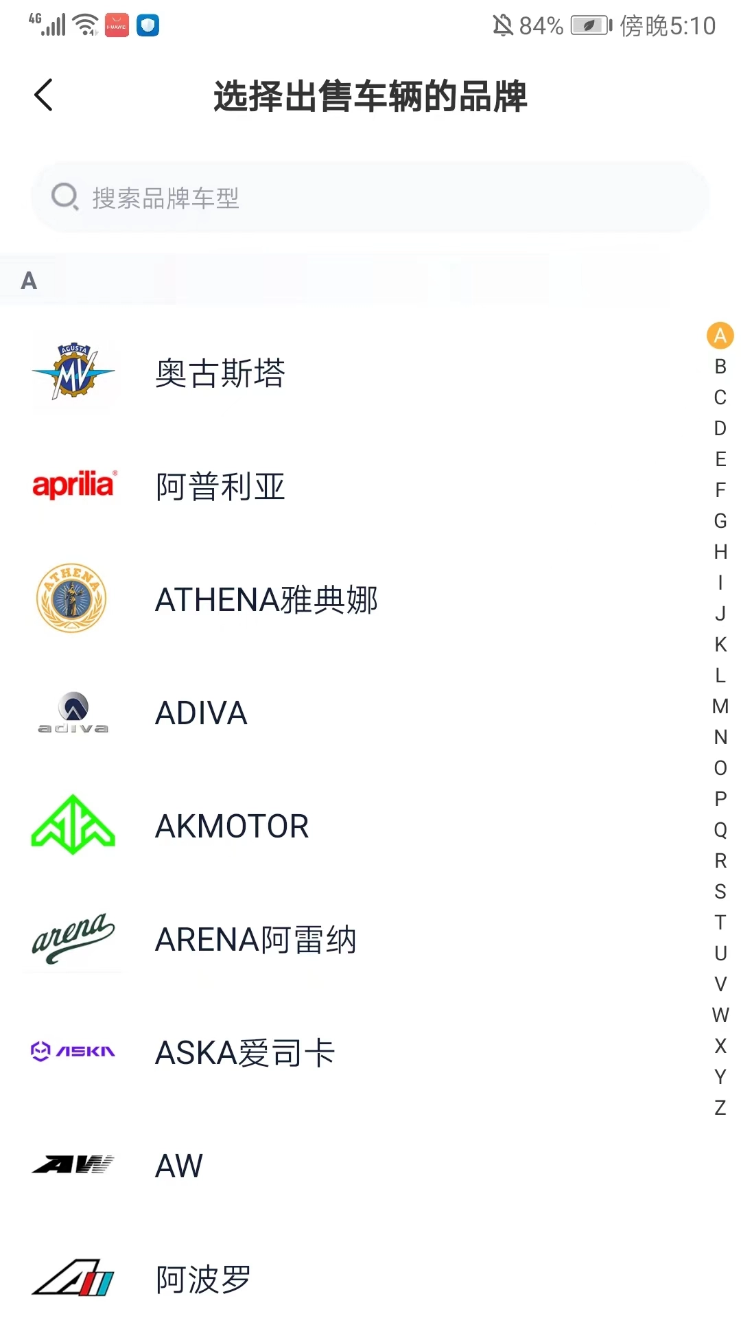 3、滑动屏幕可以浏览并选择出售车辆的品牌,也可以在上方搜索框搜索相应的品牌,