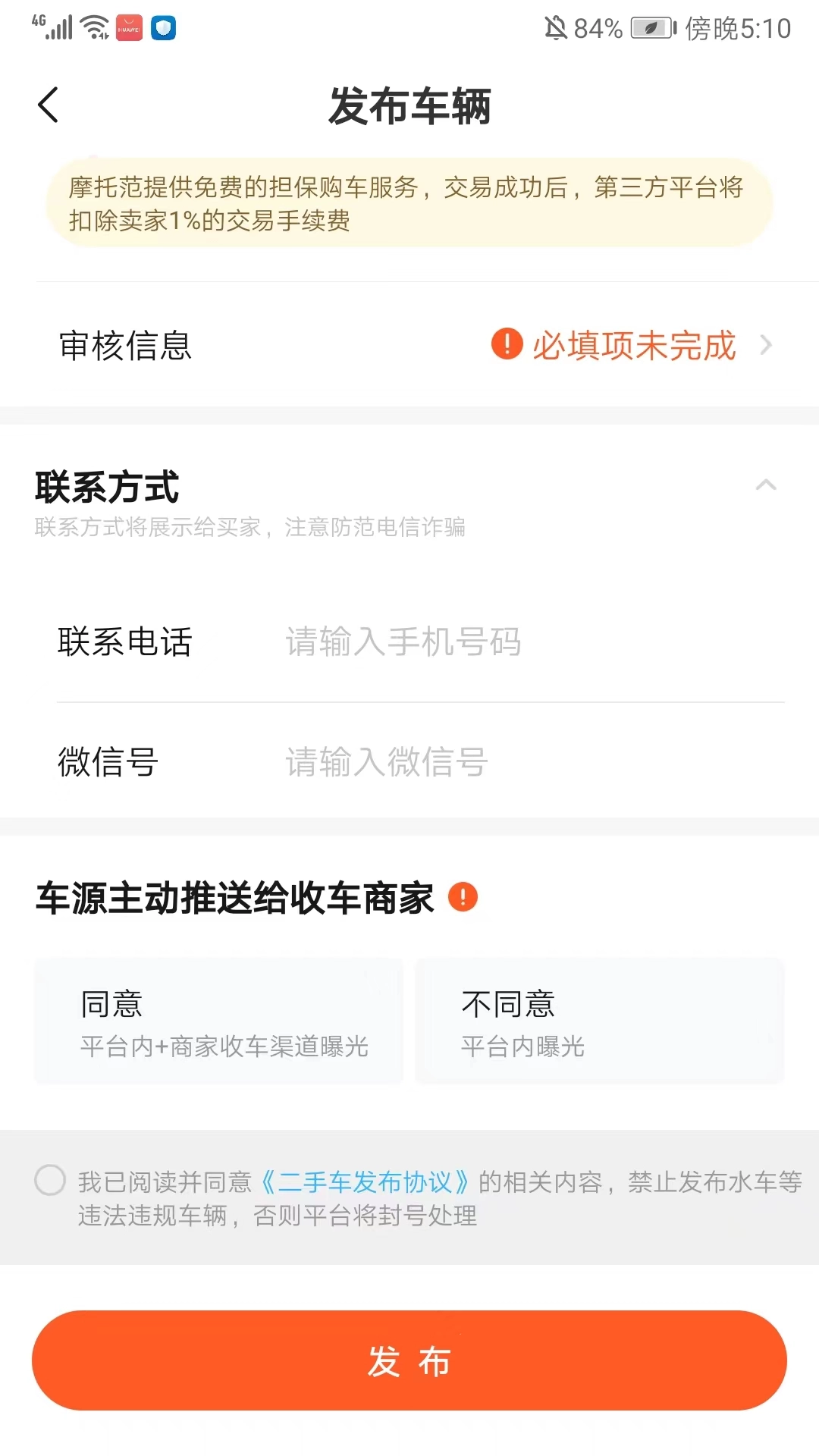 6、进入发布车辆界面,依次输入车况的相关描述、过户次数、行驶里程、转入价格以及联系方式后选择【发布】就可以卖车了。