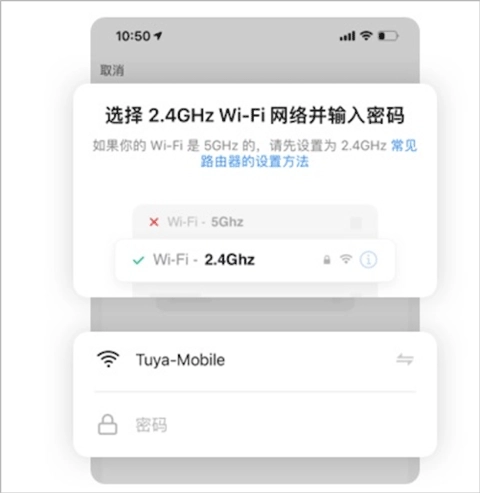 选择家中2.4GHz的Wi-Fi频段,并输入网络名称及密码,让设备连接网络。