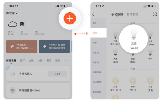 第二步:在App首页点击"+"号添加设备