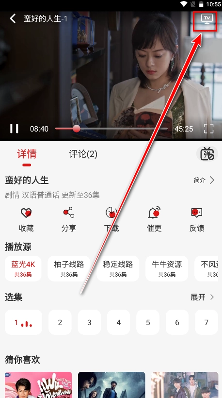 3. 在播放页面的右上角点击一个TV图标,开始进行投屏播放。