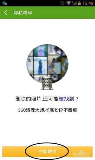 点击【立即使用】就会开始360清理大师——最强力手机清理神器。当你用360清理大师清理手机后,能够防止删除的照片恢复。