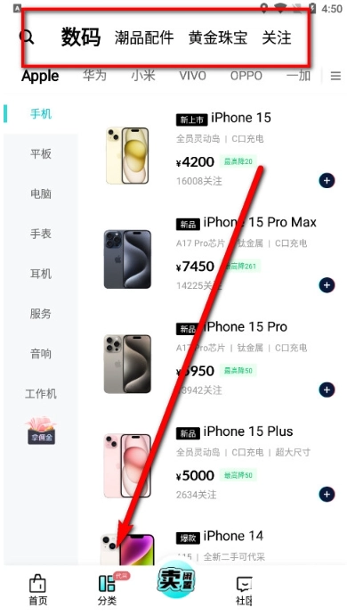 2、而在“分类”栏目中,则是有着数码、潮品配件、黄金珠宝等几个版块。