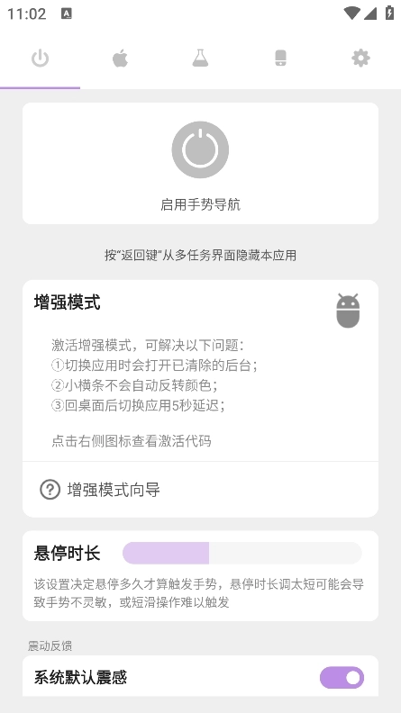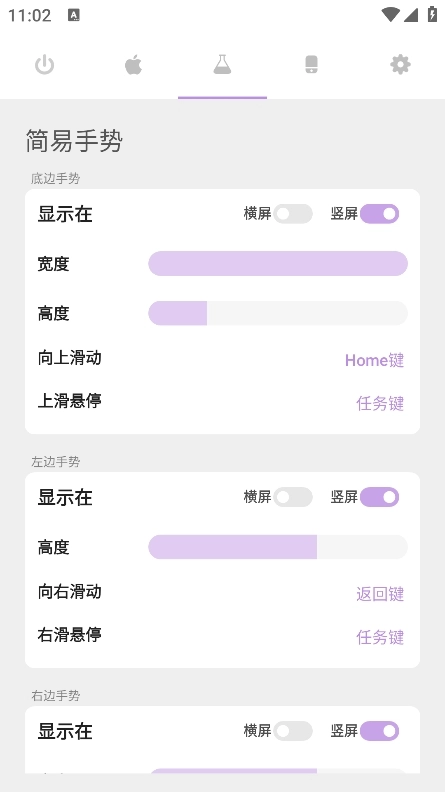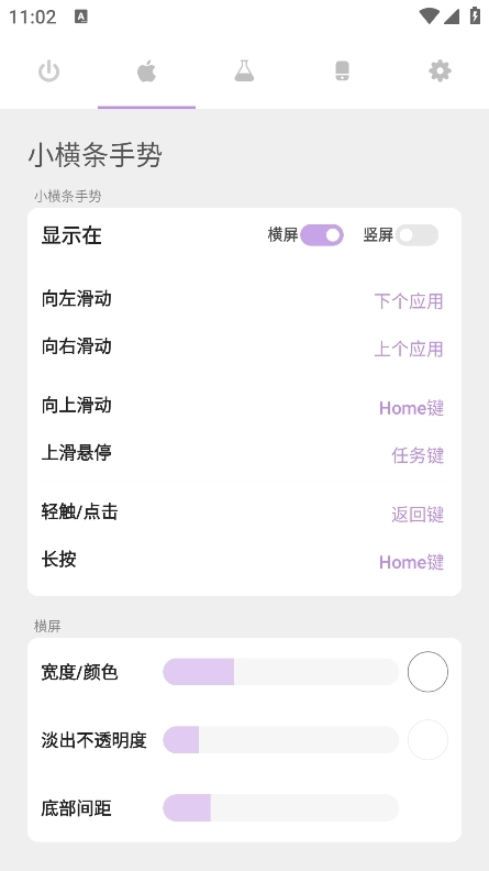 gesture小横条是一款功能十分强大的手机快捷启动与手势应用,你能够在gesture小横条里设置向左或向右滑动的快捷键,还可以自定义上下左右手势的高度和宽度,选择是否开启横屏或竖屏模式,就连底边三段的设置也能依据自身需求进行个性化调整。要是你热衷于打造个性化的手机使用体验,那么gesture小横条增强版绝对是你的不二之选。