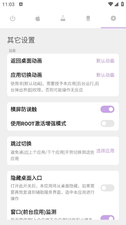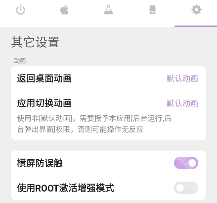 5. 还可以进行其他相关设置,如动画模式、Root权限增强、游戏防误触等。