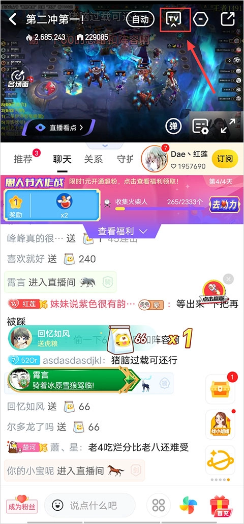 2. 在直播画面的右上角会出现一个“TV”图标,点击该图标。