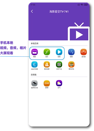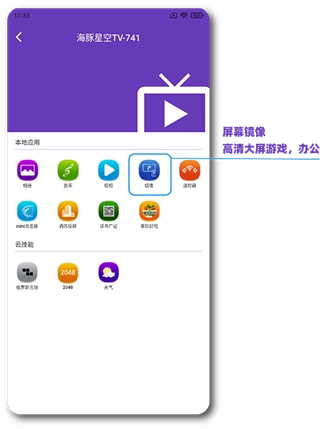 您可以在本地应用列表里,把视频、音频和相片投射到大屏接收端进行观看,还能借助镜像功能将手机屏幕同步到大屏上。