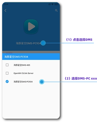 会搜索同一WIFI网络内的可用设备,并将其显示在DMR设备列表中,点击您想要使用的设备名称即可。