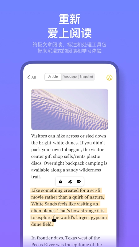 在锁屏或主屏幕展示未读的文章和已标注内容,随时利用碎片时间,开启专注阅读或回顾重点。
