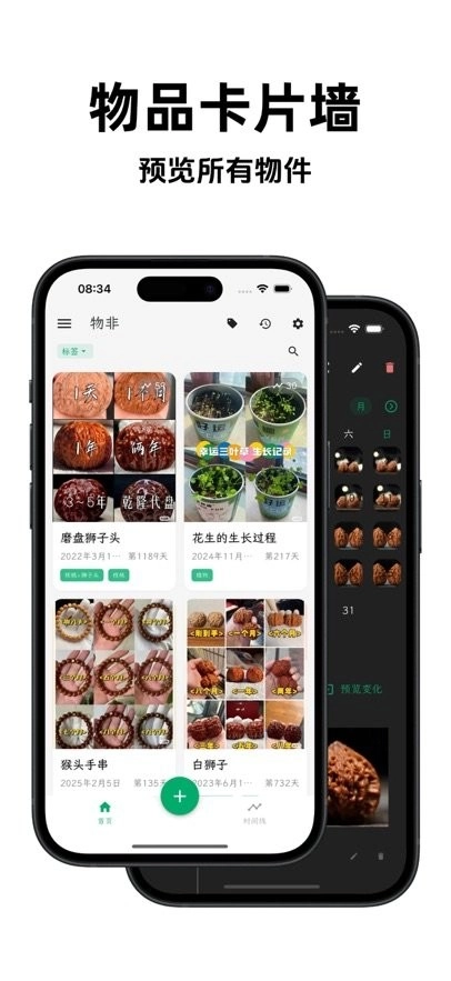 记录物品的每一次变化,见证时间留下的痕迹。无论是植物的生长、文玩的挂瓷包浆,还是创作过程的迭代,亦或是身材变化,「物非」帮你构建专属的时光记录笔记。