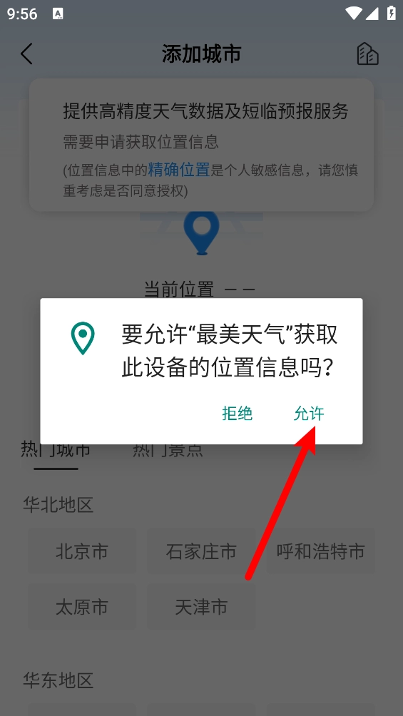 2、授权完成后,在手机端最美天气应用中添加您关注的天气站点。