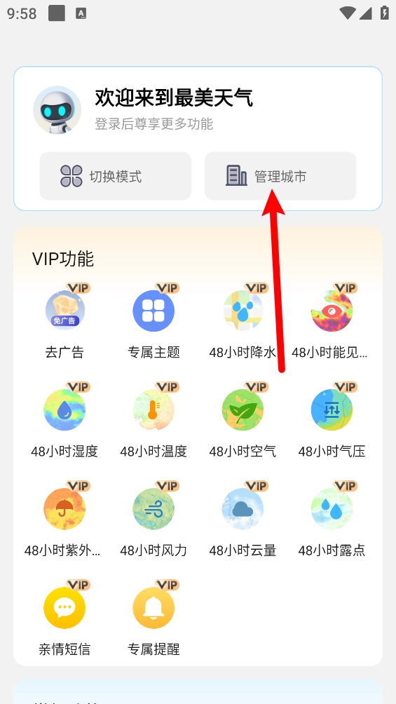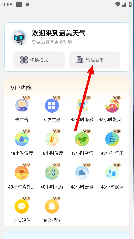 4、点击主页左上角三条横线,进入后可以点击"管理城市"。