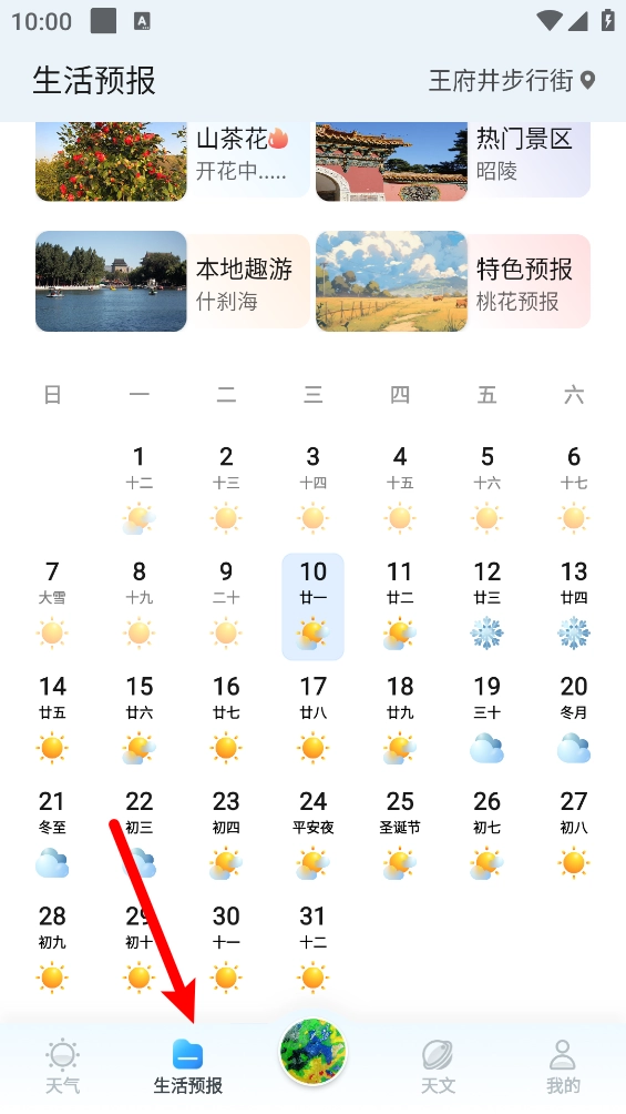 6、在生活预报板块,可以查看每日的日历和城市景区。