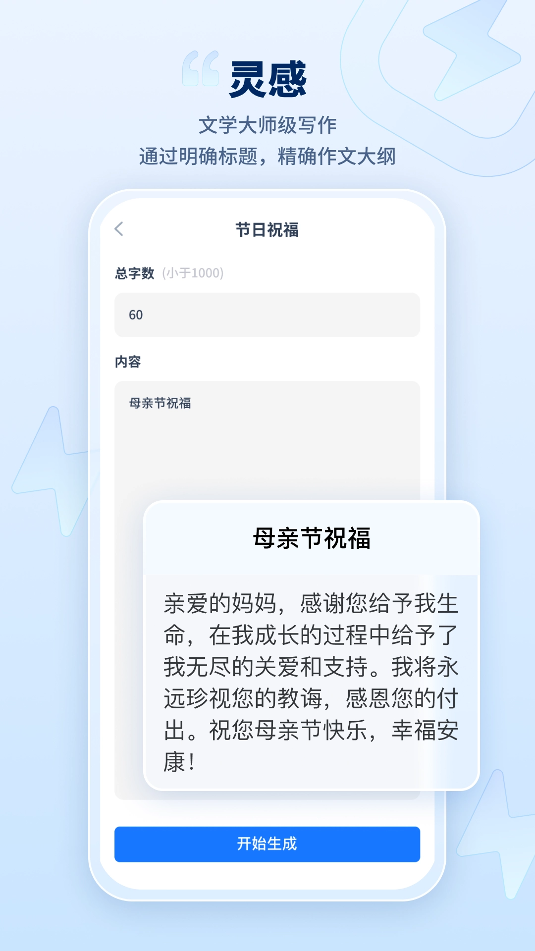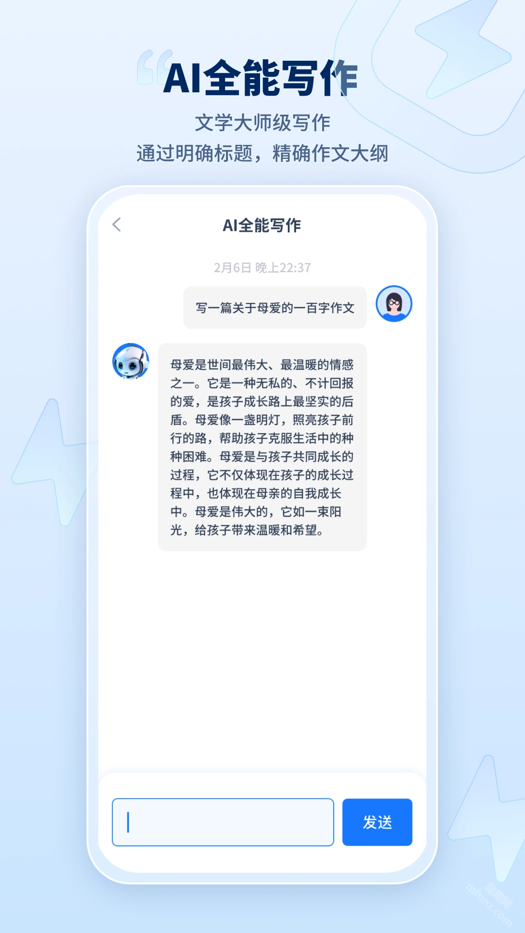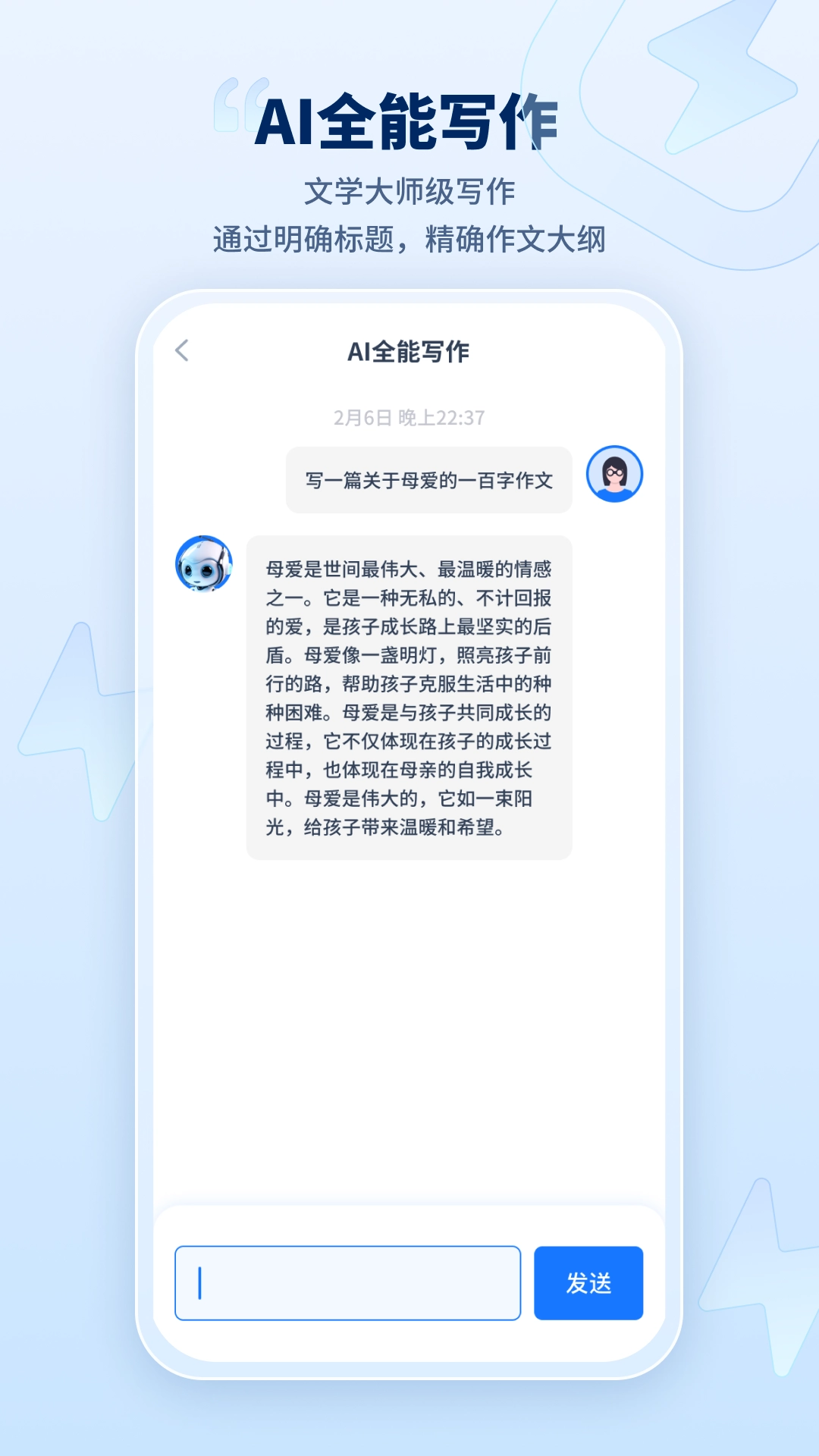 拥有强大的人工智能技术,仅需输入中心思想就能一键自动生成文章,这极大地提高了写作效率,无论是推广文案还是作文写作都适用。
