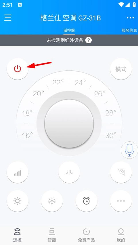 5、打开空调遥控器,点击红色按钮即可检测到红外设备并开启空调。
