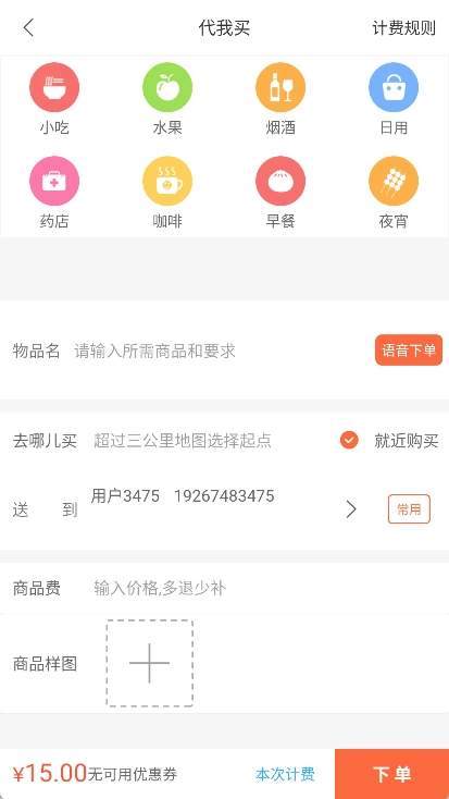 2、代买服务:用户下单,跑腿人员购买商品后送货上门,商品费多退少补。
