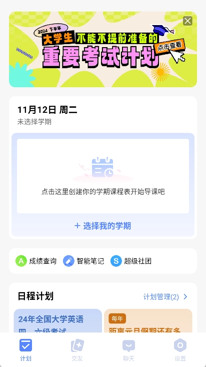 5. 个性化设置:支持学期设置、当前周数显示以及上课时间提醒,个性化管理学习进度。