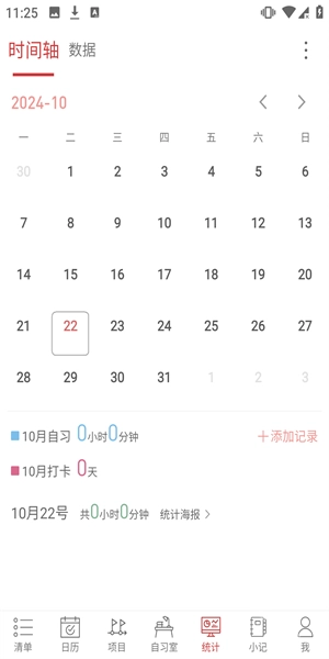 4、在统计这里可以记录自己的每天自习的时间、打卡时间。