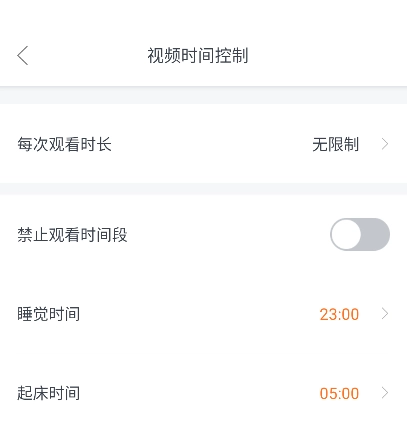 5、在视频时间控制页面可以设置每次观看的时长,以及禁止观看的时间段。