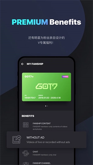 通过亲自设计粉丝专属的高端VIP会员FANSHIP,以及可终身领取的VLIVE+超清视频观看权益,让粉丝能更近距离地了解艺人。
