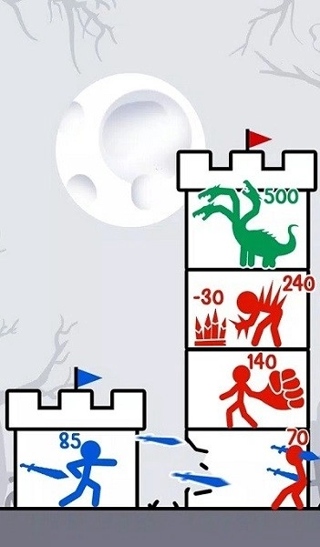 2、策略强战斗机制:运用策略和智慧来指挥火柴人队伍,抵御敌人的进攻,选择合适战斗策略。