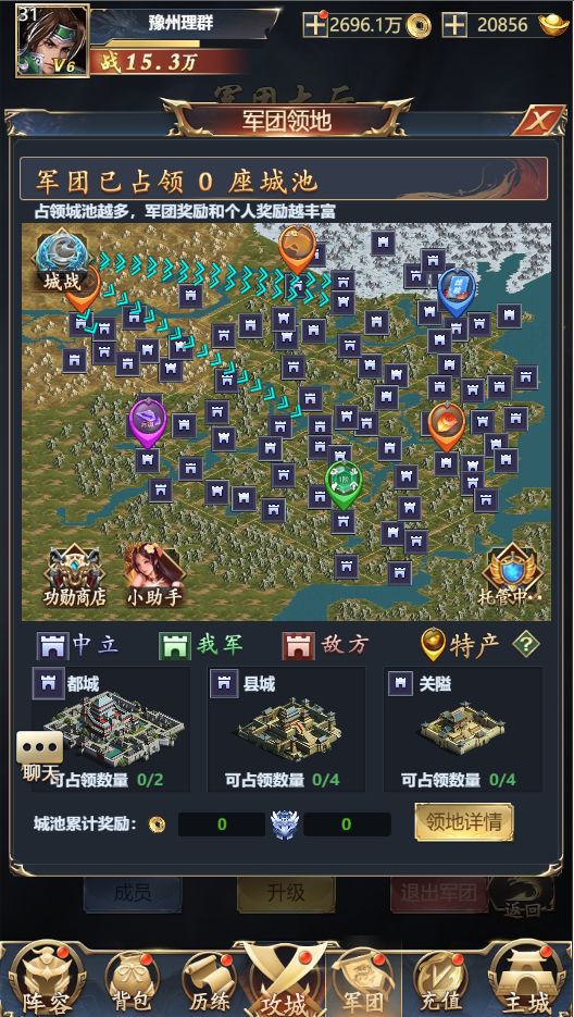 加入军团之后,攻陷其他城池且满足占领条件时,该城池将成为本军团领地。领地城池可产出铜钱及功勋资源,在领地功能中可查看领取领地奖励。