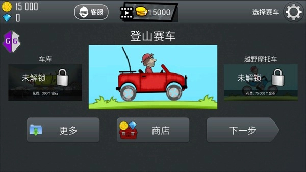 4、进入登山赛车后,我们需要通过关卡赚取一些金币,如下图所示,此时金币为15000。