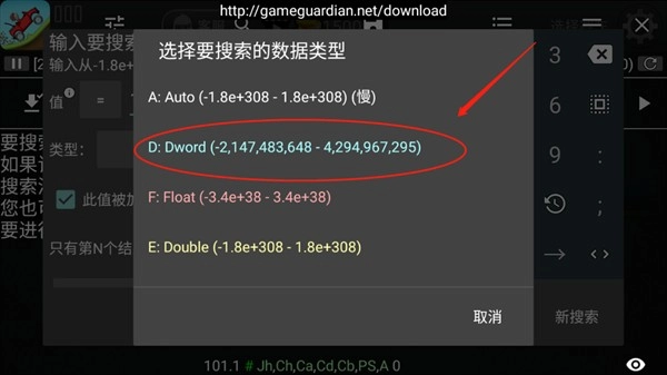 8、选择DWORD数据类型(此类型可加快搜索速度)。