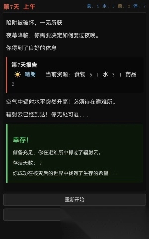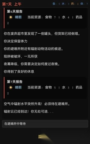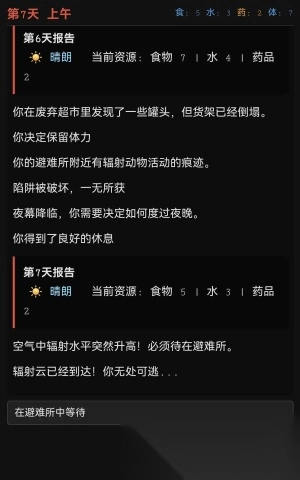 快醒醒!此刻,地球仅剩最后的七天!你得立刻行动起来,尽快收集各类资源,带上关键物资,迅速躲进家中的避难所,以此避开辐射云带来的致命威胁。在避难所中,你只能凭借有限的物资维持生存。这段时间里,你或许会遭遇形形色色的抉择:是救助他人,还是保全自己?该大胆冒险,还是小心谨慎?要知道,你的每一个选择,都将改写最终的结局。