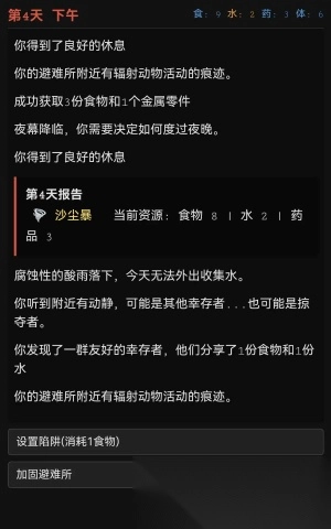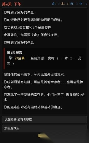 3. 期间会遇上各种各样的随机事件,例如遭遇掠夺者、变异生物、辐射风暴等等,需要你做出关键选择。