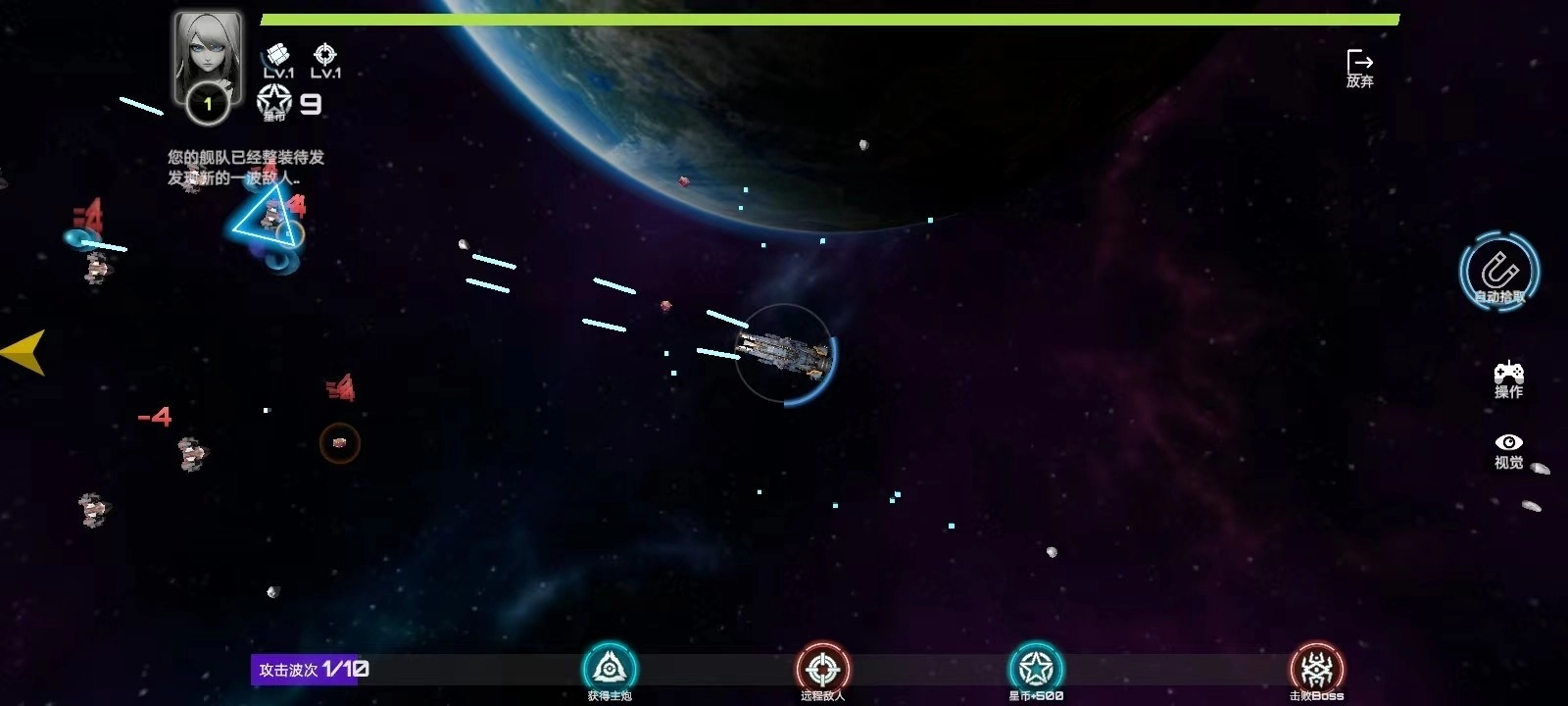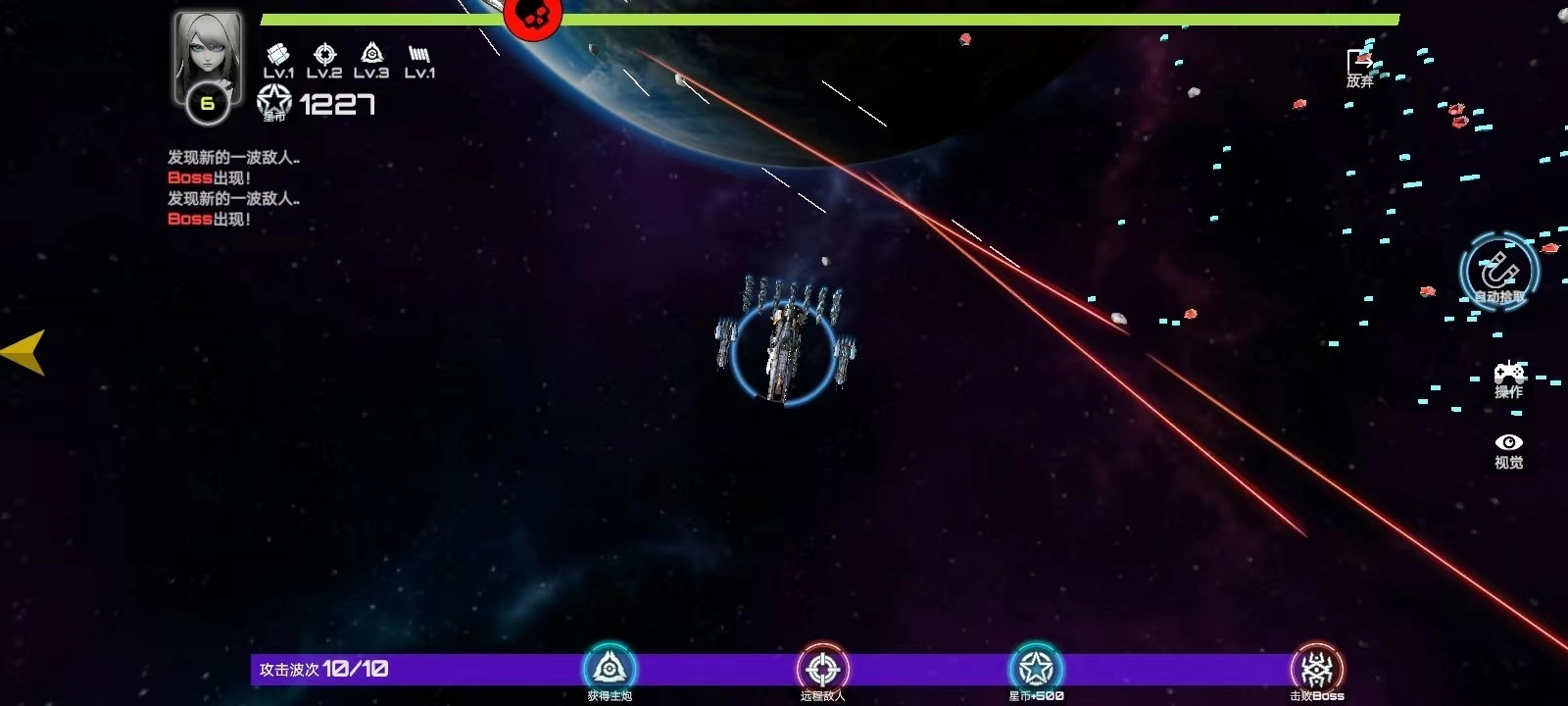 3、一共有十波敌人,玩家全部击败之后,就可以成功;进入游戏后,战舰会自动识别敌人进行射击。