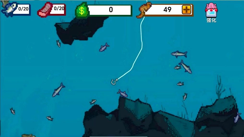 2、游戏玩法简洁明了,玩家只需用鱼钩触碰小鱼即可成功钓起。每个道具都有其独特的作用,如不同等级的鱼钩决定了在水下持续的时间,而刮刀的等级则影响去除鱼鳞的效率,满级刮刀能够快速且精准地去鳞而不损伤鱼皮。