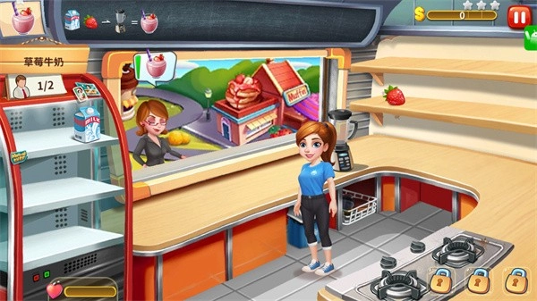 5、接着去挑战下一关,拿起左侧的牛奶,右侧的草莓,全部放入搅拌机中,就能完成订单。