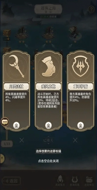 每次击败一次敌人后都可选择一种迷雾祝福,迷雾祝福可以提高阵容在迷雾之海中的属性。只有合理的选择神器才能打到第三层,获得终极奖励!