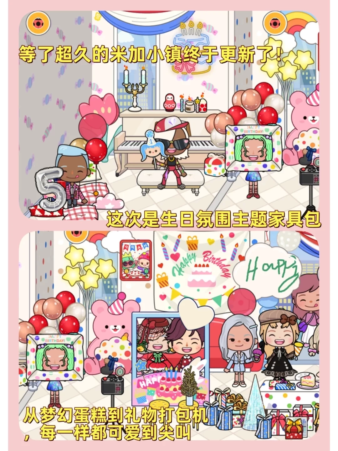 米加小镇世界深受玩家的喜欢,在上线了诸多新建造后又更新了和节日有关的家具组合包,新增了大量的礼物和礼物盒子,搭配生日派对可以给朋友最大的惊喜,感兴趣的玩家赶快更新到最新版本吧!