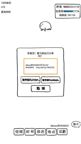 照顾homoo获得经验值,经验值满后就会升级,还会获得新的称号。