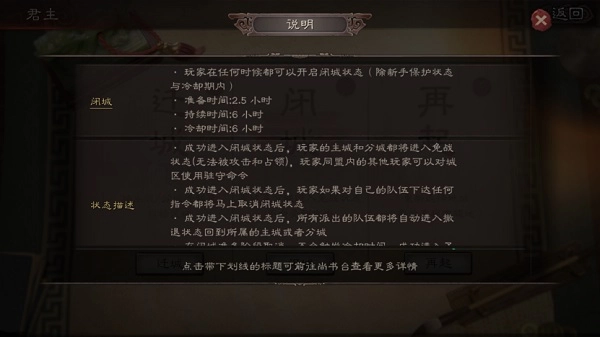 3、闭城与攻城:在这个游戏中,如果你想暂时摆脱对手干扰,可以开启闭城状态,这样对手就无法对你的城池造成伤害,但是需要2.5小时进行准备,持续6个小时;而攻城的时候,需要在对手没有开启闭城时进行,不然会白费力气无法顺利攻城;