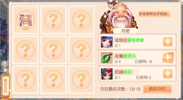 2、加入帮派后,可以领取帮派委托任务,完成后将获得大量帮贡奖励。每天可以完成6次委托任务,未完成的次数会累计到下一天,最多可以累计到周日。点击任务牌可能随机获得不同星级的委托任务,按照委托订单提交相应的物品后可以交付订单,星级越高获得的帮贡越丰厚。完成五星任务有机会获得神秘礼盒,可能开出稀有的道具奖励。