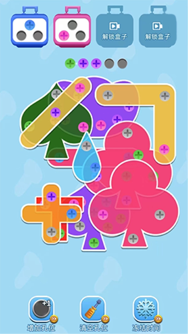 1、增加孔位,冻结时间,可暂停关卡计时,合理运用这些道具,能突破复杂关卡。