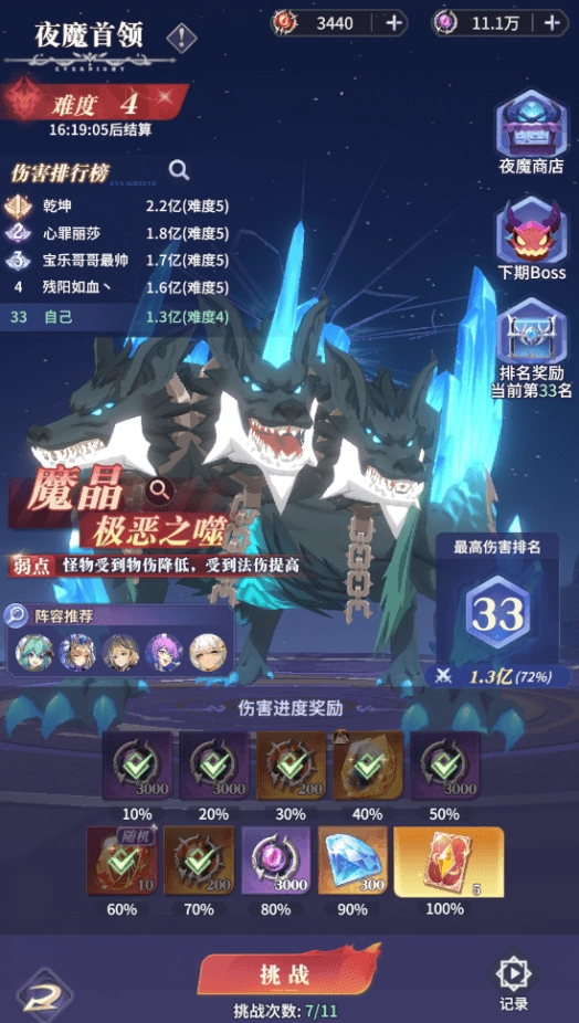 夜魔首领是每天结算排行奖励的,有专武碎片以及夜魔勋章资源,5种boss循环出现,分别需要上阵毒、法伤、控制、灼烧、物伤对应的角色来打,因此每个阵营都需要练一些输出来争夺排名奖励,这里根据本次内测,针对每个boss推荐几个常用输出角色: