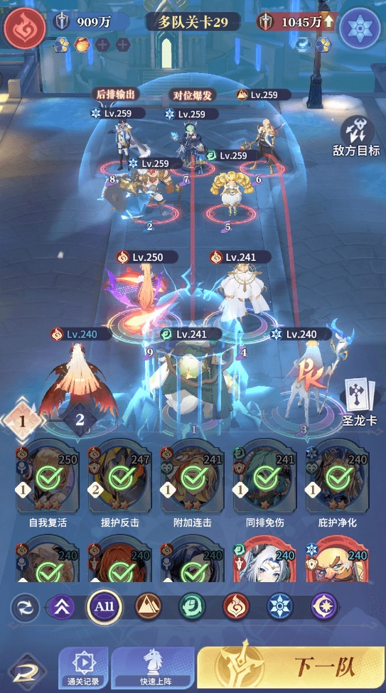 单队挑战到达280关后即可解锁多队挑战,需要上阵两队不同阵容应对,因此需要培养8-10个左右的角色;