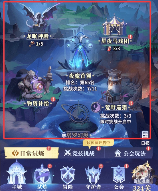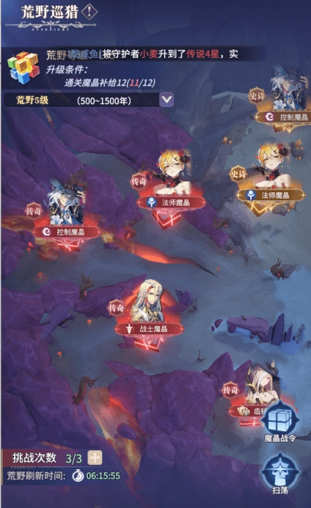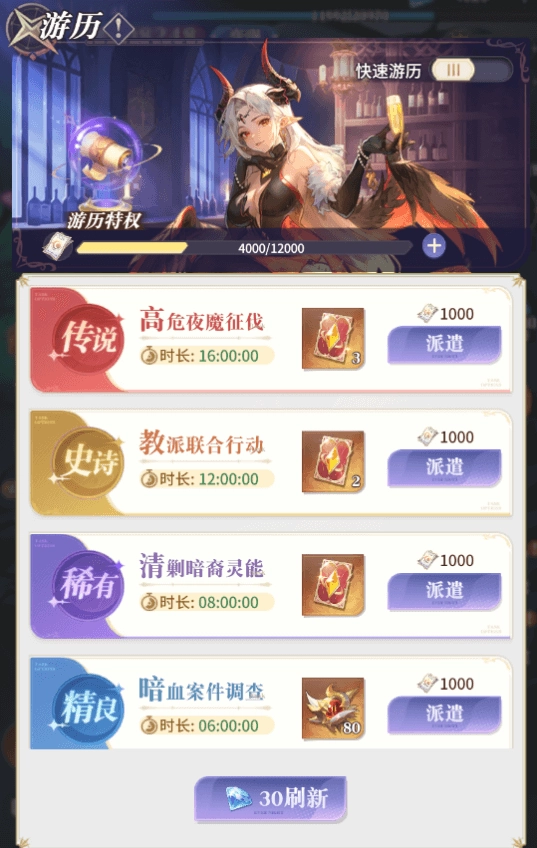 冒险界面左侧的游历是我们在永夜世界中获取资源的重要途径,突破石、钻石、守护之魂、圣龙相关材料、魔偶谜箱、契约卡牌、契约水晶等关键养成道具应有尽有