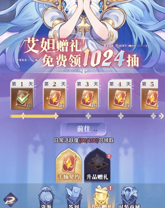 每天上线必完成160活跃度,获取契约卡牌、契约水晶、钻石等重要资源;同时,每天100活跃度可以领取10抽契约卡牌,持续100天左右