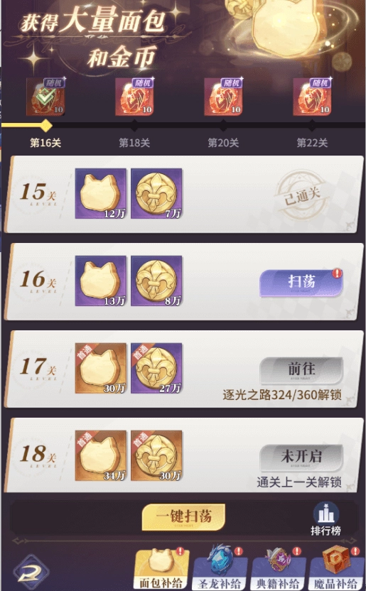 物资补给共包含四部分:面包、圣龙、典籍、魔晶,每天都尽量打到打不了后再扫荡,前期扫荡次数必买满,快速提升战力
