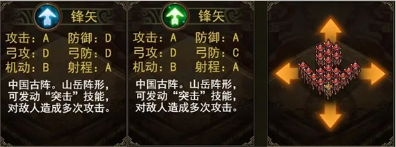 锋矢阵:有“摧锋”、“连攻”姜维在学习一个锋矢阵,玩连攻也是很不错的选择。因为攻击力还有上升空间,建议中期再来选择这套阵形玩法。