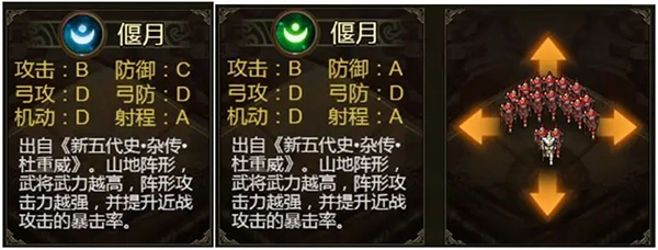 阵形: 锥形阵(1阶)、偃月阵(1阶)、鹤翼阵(1阶)、鱼丽阵(1阶)