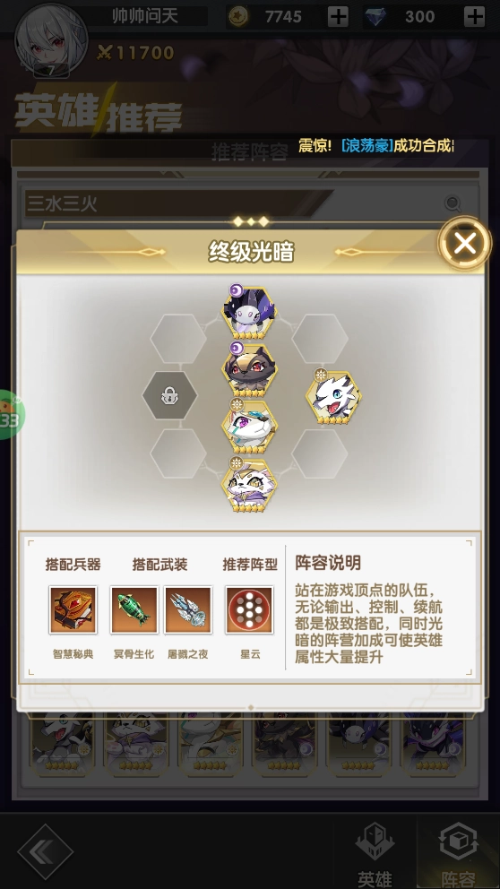 站在游戏顶点的队伍无论输出、控制、续航都是极致搭配,同时光暗的阵营加成可使英雄属性大量提升