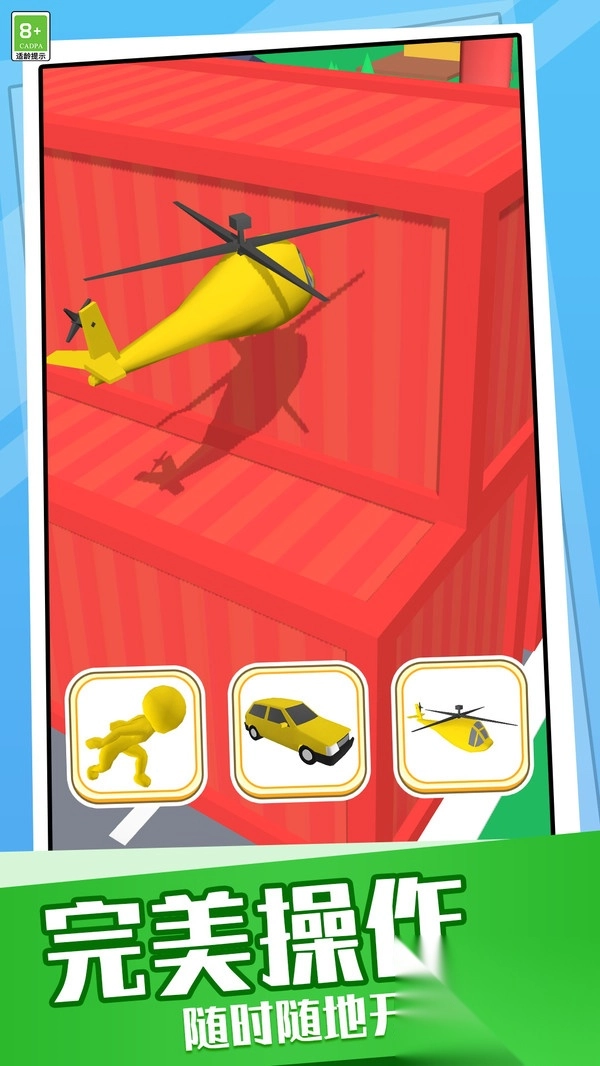 3、玩家操控黄色直升机在复杂环境中飞行,紧贴红色集装箱,考验操作精准度。