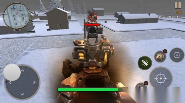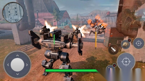 1. 借助控制轮盘来操控机甲移动,在屏幕上设置有射击、技能释放等功能按键,以此来发射火箭弹,并切换武器模式。