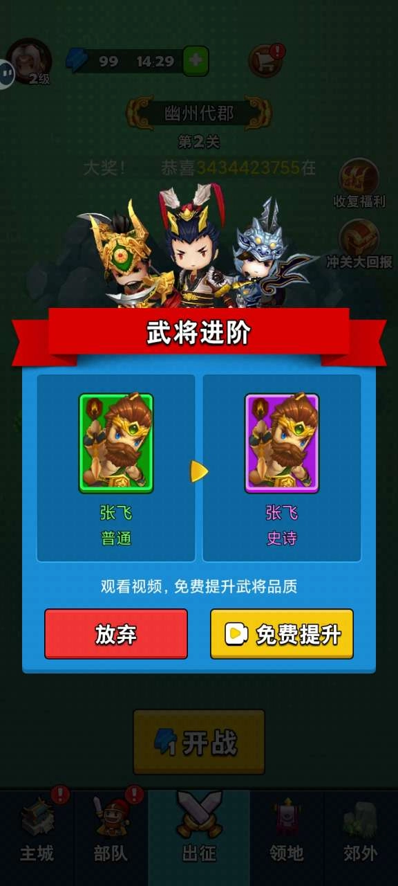 6、当获得英雄时,会有一定几率触发视频观看,可以提升英雄的等级,玩家可以自行选择是否观看。
